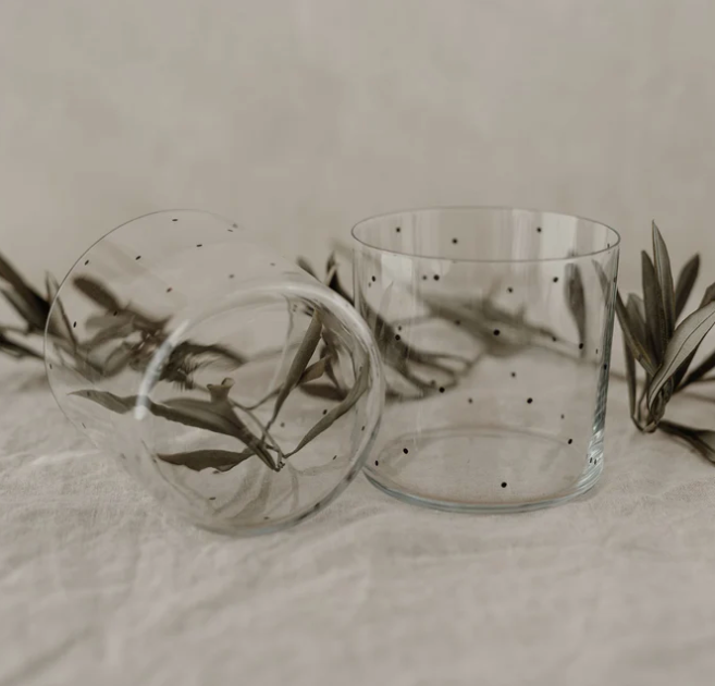 Entdecke zwei wundervolle zylindrische Trinkgläser mit schwarzem Druck an der Glaswand und einer schlichten Eulenschnitt Gravur im Boden. Unsere neuen Trinkgläser sind sehr dünnwandig und dadurch super leicht und dennoch extrem stabil, sowie stapelbar. Genau das macht sie in Verbindung mit dem minimalistischen Design so besonders. Beide Gläser zieren ein Punke Allover Design. Einfach ein ganz besonderer Hingucker in deiner Küche - ob als Wasserglas, Cocktailglas, Dessertglas oder aber auch zum Anrichten von Früchten, Snacks oder Müsli!