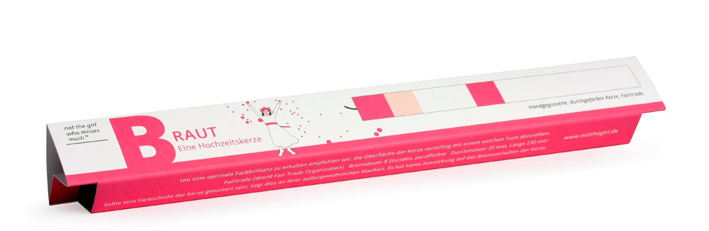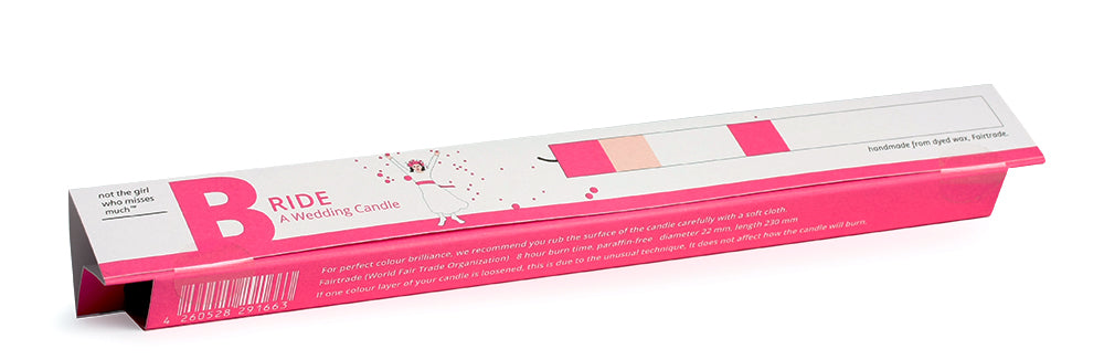 Ein Geschenk, Glückwunsch oder ein Gruß – jedes Thema findet bei uns seine passende Kerze, einzeln in einer farbigen Kartonage verpackt. Die Kerze besteht aus durchgefärbtem Wachs – aufwendig wird bei ihrer Fertigung Farbschicht für Farbschicht von Hand gegossen.