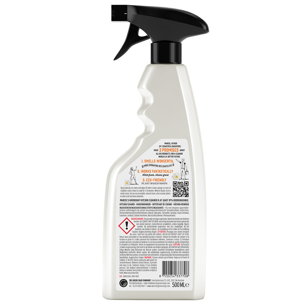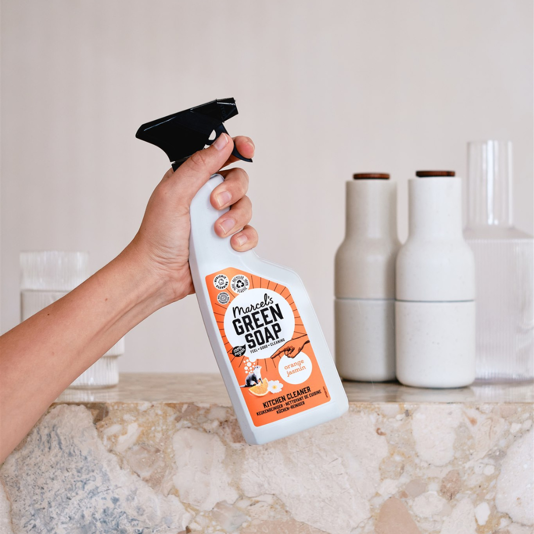 Marcel's Green Soap Küchenreiniger Spray Orange & Jasmin wurde speziell zum Entfernen von festsitzendem Fett entwickelt und lässt Ihre Arbeitsplatte, Küchenschränke und Kochfelder glänzen wie nie zuvor.