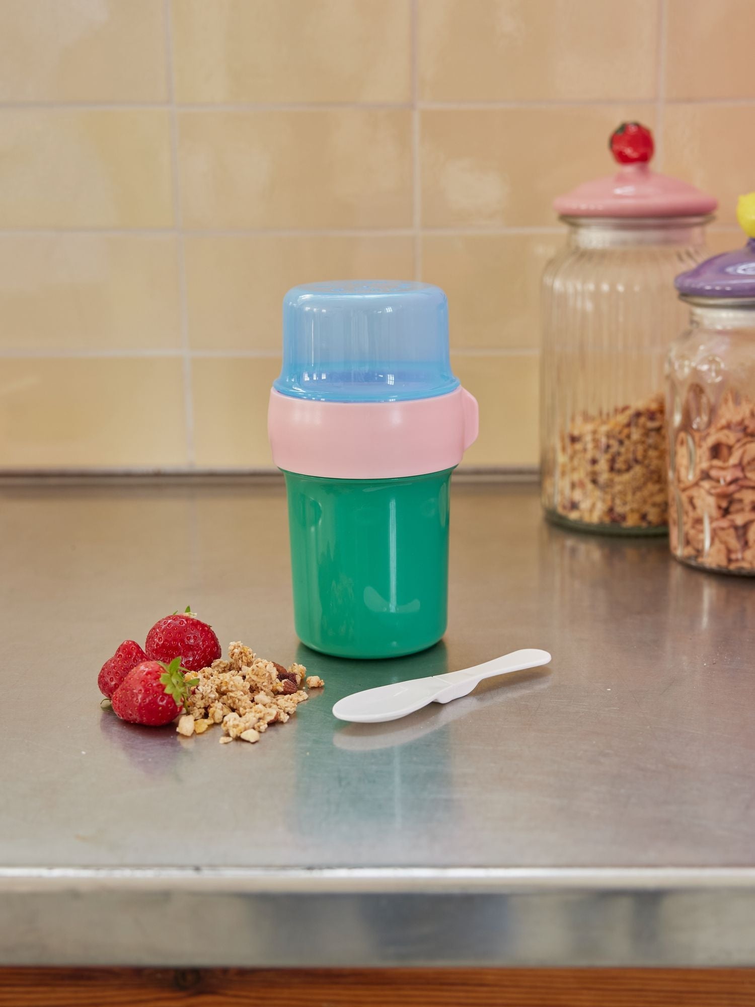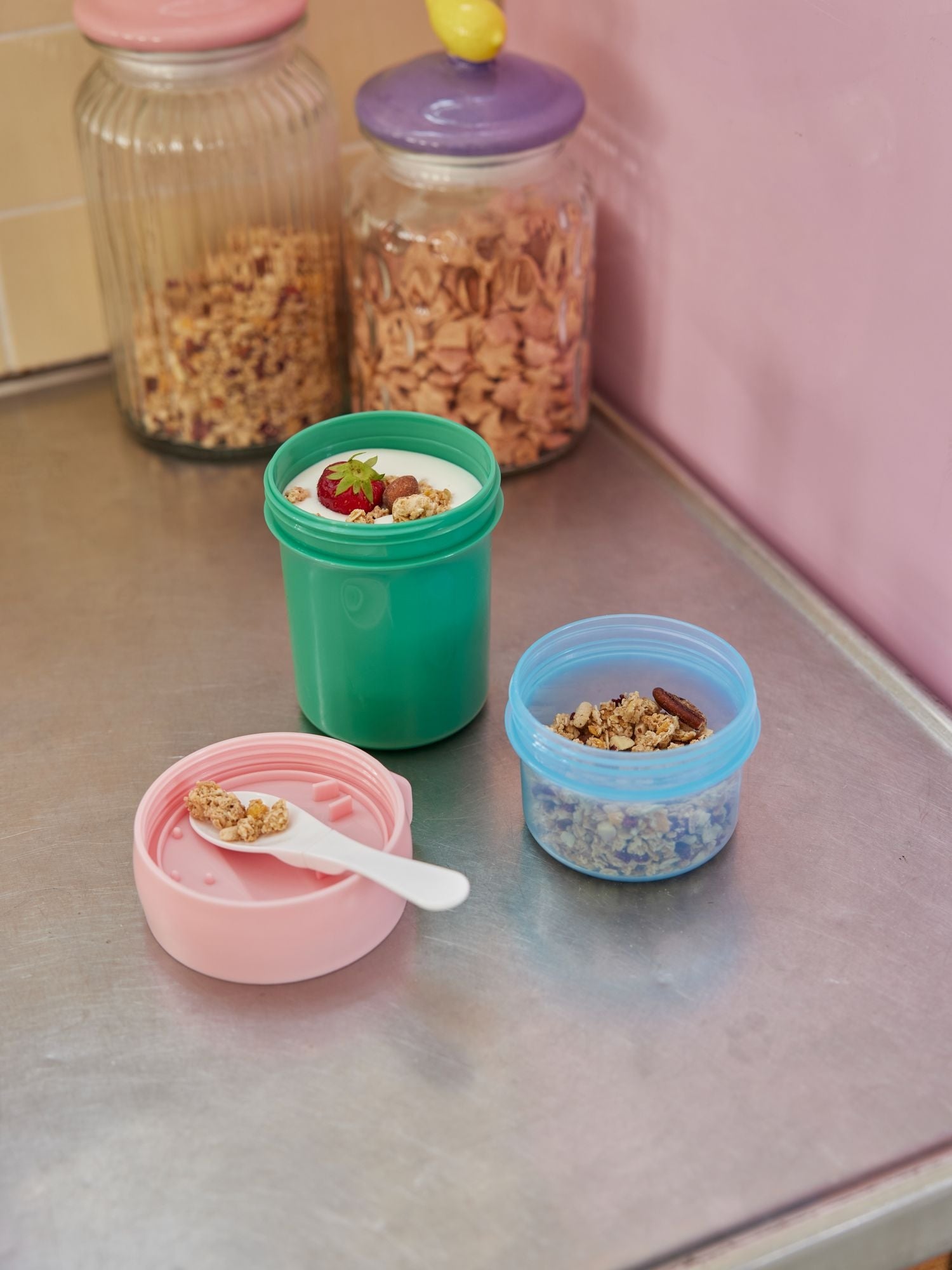 Starte deinen Tag wunderbar mit unserem grünen und blauen Müsli-Behälter! Perfekt für das Frühstück unterwegs oder einen schnellen Snack... aber auch super für Croutons und Mittagssuppe! Er kommt mit einem praktischen Löffel, der im Deckel verstaut ist, also brauchst du dir keine Sorgen um Besteck zu machen.