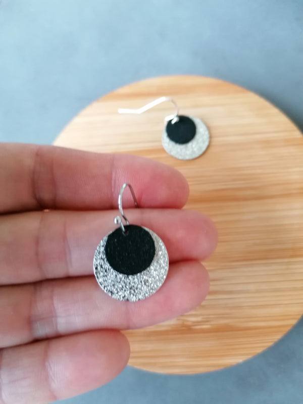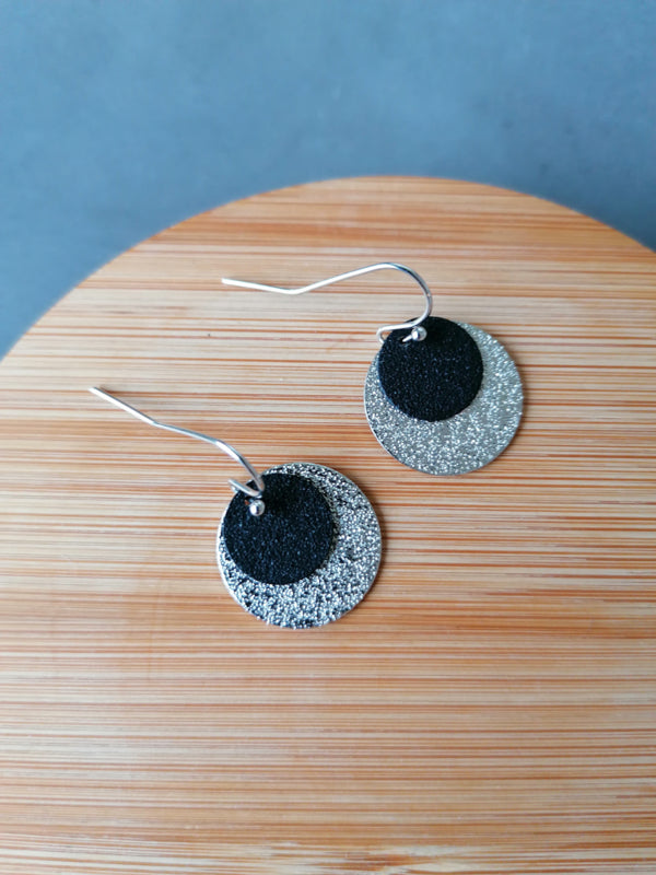 Schwarze Haken mit silberner Scheibe und schwarzer, runder Scheibe.