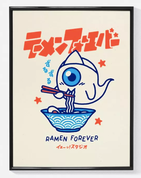 Diese Illustration stellt eine unserer Originalfiguren dar, die von der japanischen Popkultur inspiriert ist und erzählt: Yû, wie er eine Schüssel Ramen isst. Yû ist ein Yûrei (japanischer Geist), wie das weiße Dreieck namens Hitaikakushi zeigt, das er auf seiner Stirn trägt.