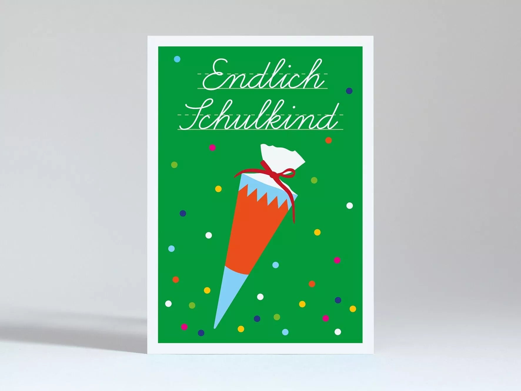 Schöne farbenfrohe Karte zum 1. Schultag. Gedruckt auf hochwertigem Recyclingpapier, Kartenrückseite blanco.