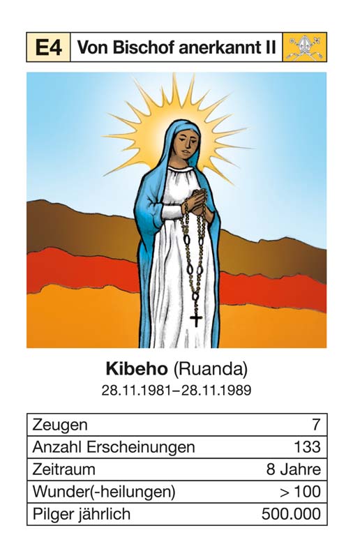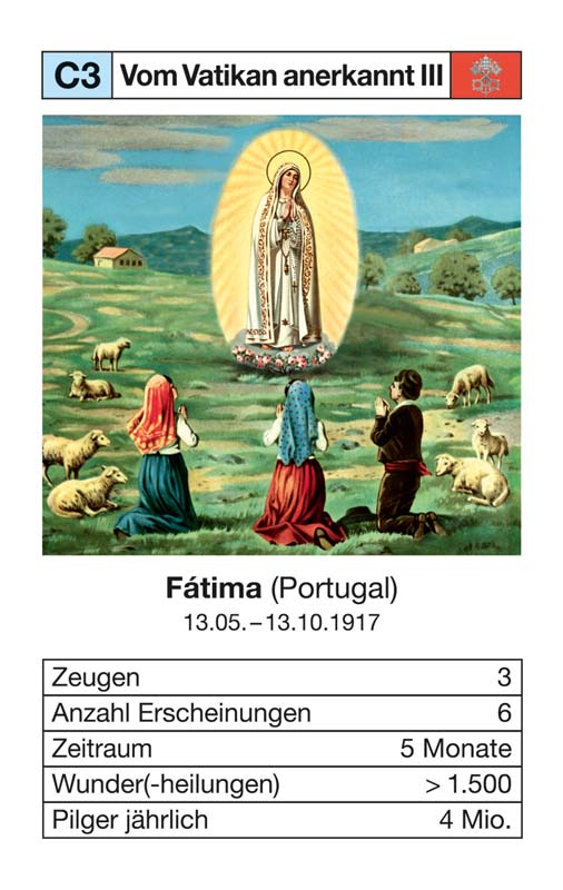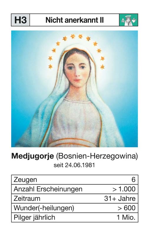 Spielkategorien: Zeugen, Anzahl Erscheinungen, Zeitraum,Wunder(-heilungen), Pilger jährlich