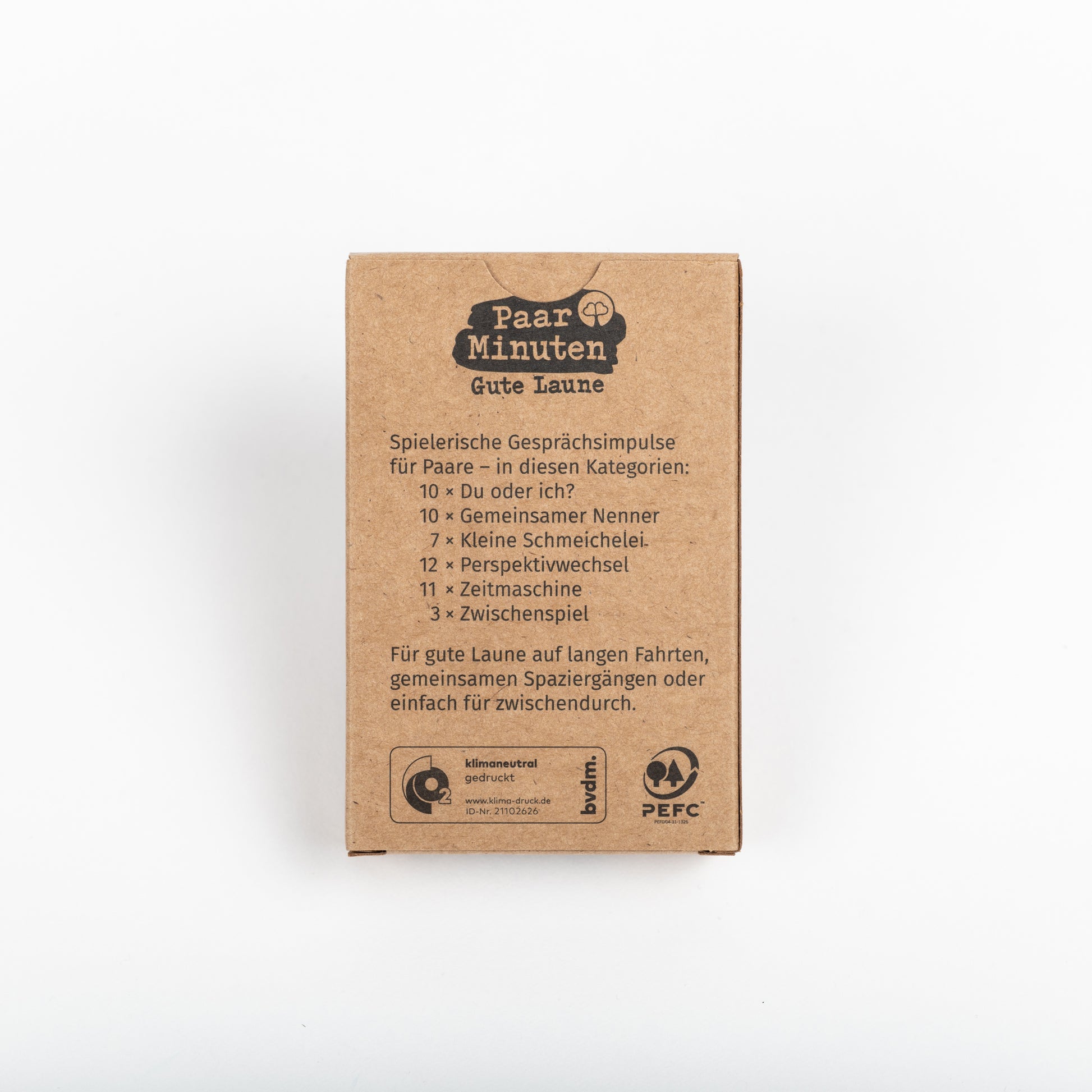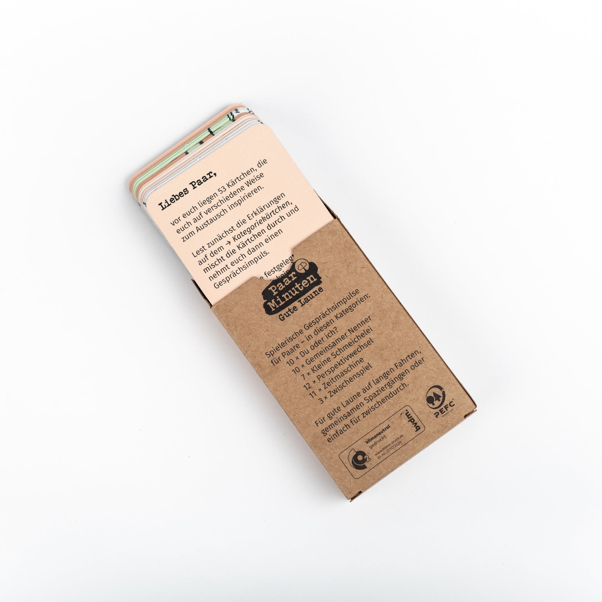 Die Kategorien unserer PaarMinuten laden euch zu einem spielerischen Austausch ein. PaarMinuten ist kein Spiel im klassischen Sinn, denn ihr benötigt weder eine komplizierte Anleitung, noch müsst ihr von vornherein eine lange Spielzeit einplanen – ihr könnt einfach loslegen. Bei PaarMinuten geht es nicht ums Gewinnen, sondern darum, miteinander Spaß zu haben und eine schöne Zeit zu verbringen.
