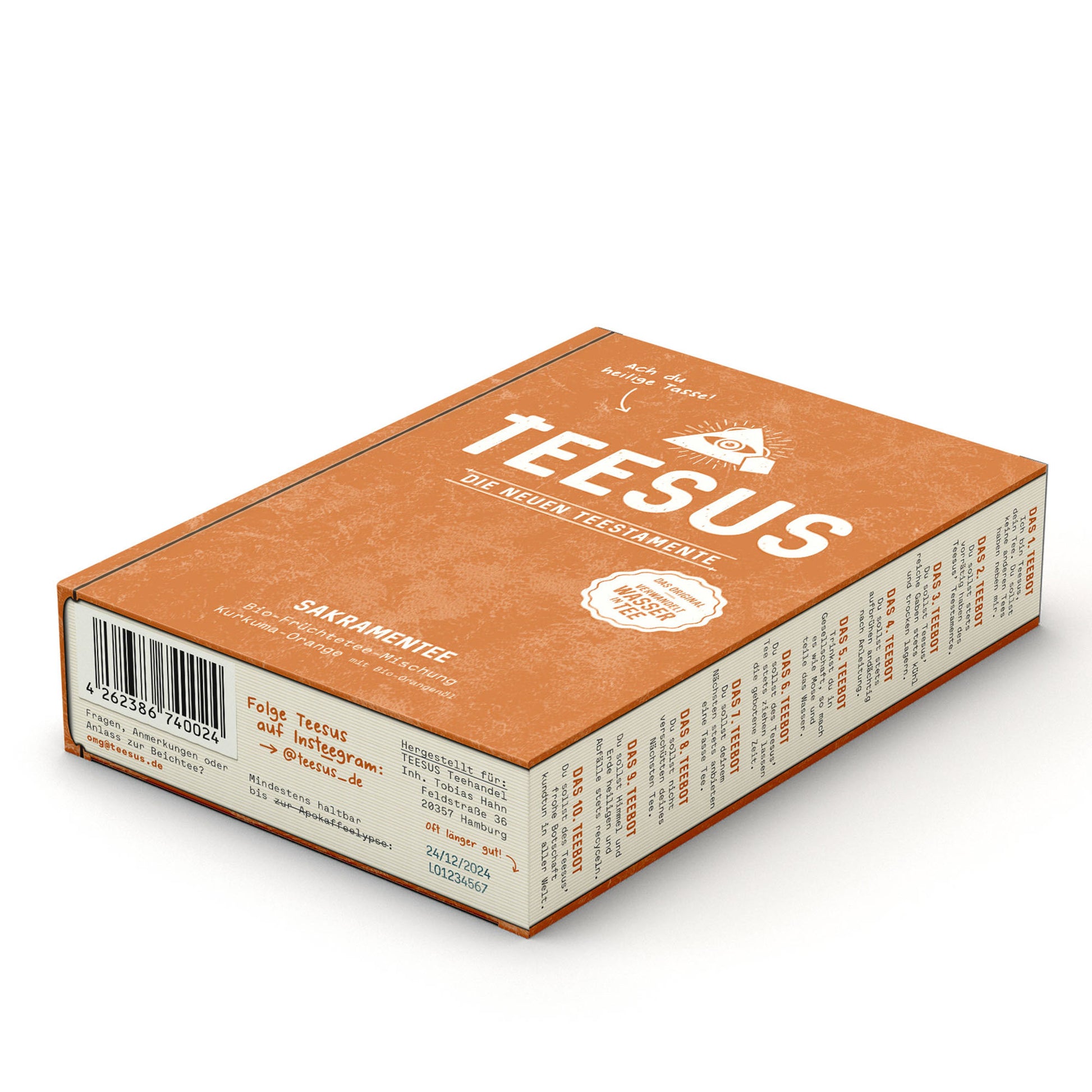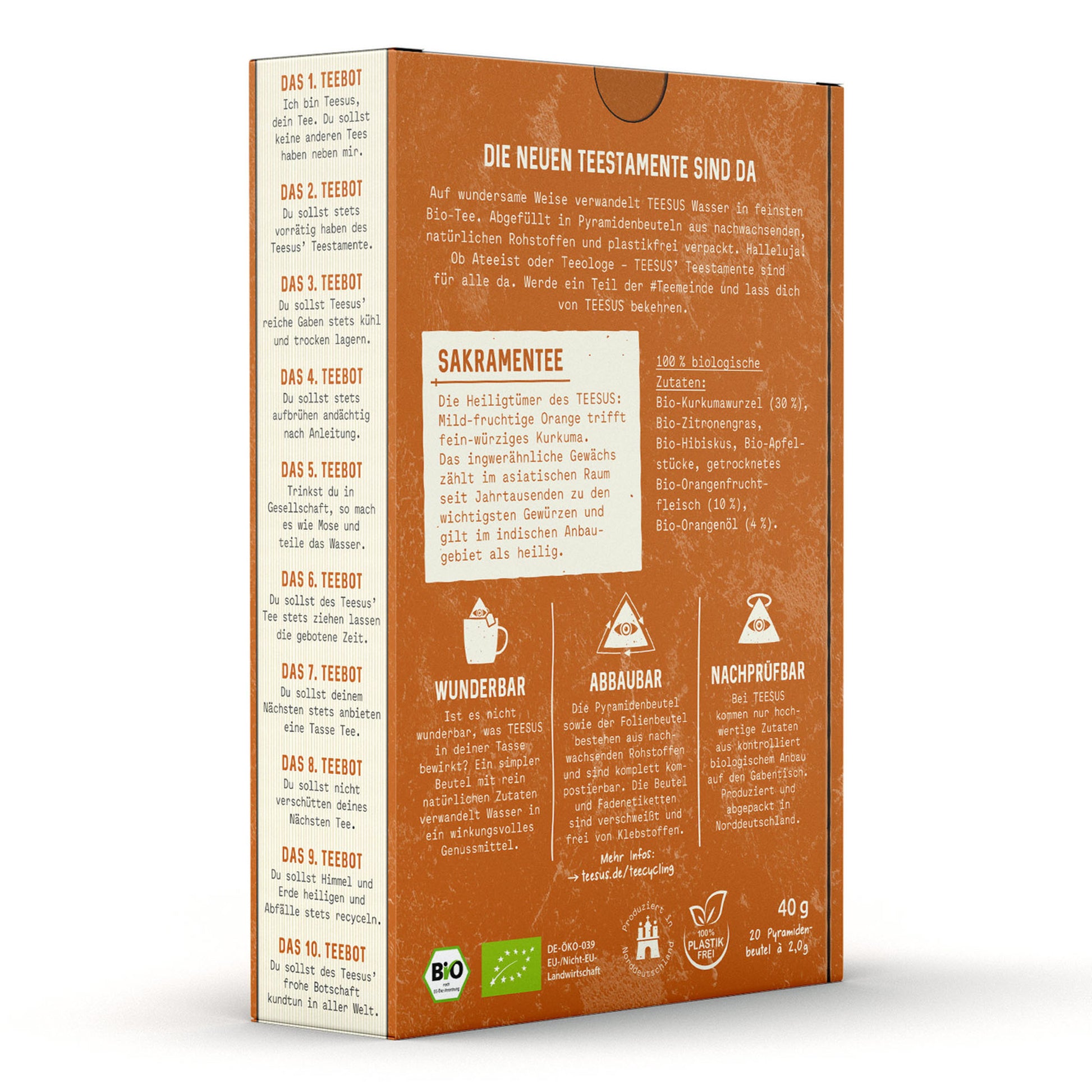 Die Heiligtümer des TEESUS: Mild-fruchtige Orange trifft fein-würziges Kurkuma. Das ingwerähnliche Gewächs Kurkuma zählt im asiatischen Raum seit Jahrtausenden zu den wichtigsten Gewürzen und gilt im indischen Anbaugebiet als heilig. Alle Zutaten stammen aus zertifiziert biologischem Anbau. Abgefüllt in Pyramidenbeuteln aus nachwachsenden, natürlichen Rohstoffen und plastikfrei verpackt. Halleluja!