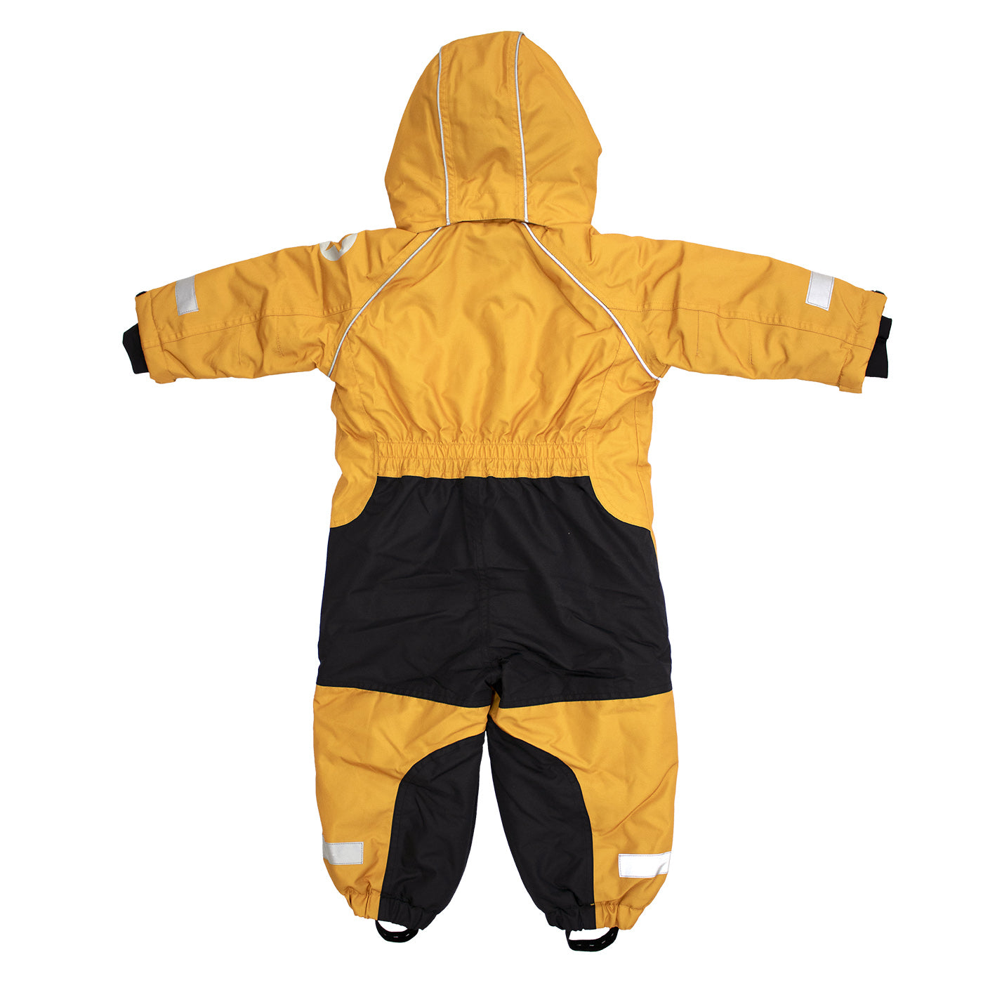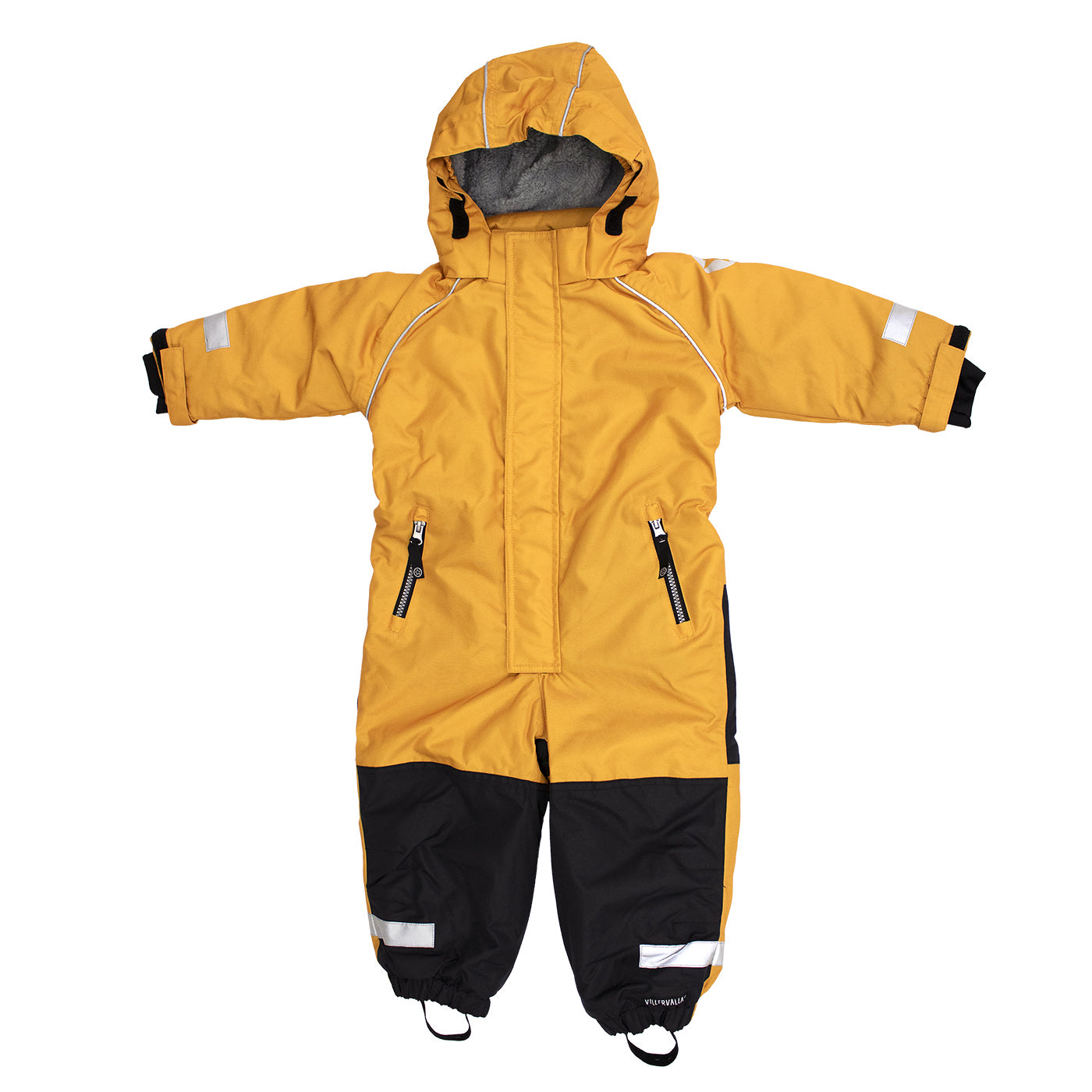 Wasserfester Winteroverall (8000mm Wassersäule) von Villervalla. Verschweisste Nähte und atmungsaktiv. Verstärkungen an den Knien und am Po. Einstellbare Armbündchen mit Schneestop und Loch für Daumen. Abnehmbares Gummiband an den Füssen. Einstellbare und abnehmbare Kapuze. Reflexe an Armen und Beinen.