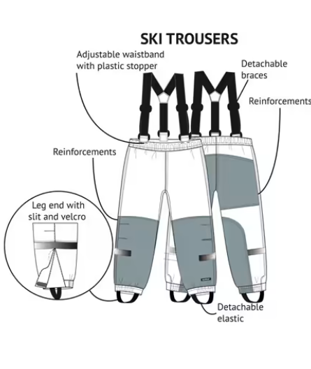 Wasserfeste Schneehose (8000mm Wassersäule) von Villervalla. Verschweißte Nähte und atmungsaktiv. Verstärkungen an den Knien und am Po. Abnehmbare Hosenträger. Einstellbare Bündchen ab Größe 98. Abnehmbares Gummiband an den Füssen. Reflexe an den Beinen.